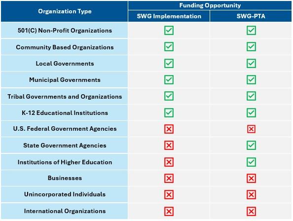 NFWF will award grants through the SWG program in 2026 with primary funding provided by EPA. Other important contributions are provided by Altria Group, the U.S. Department of Agriculture Natural Resources Conservation Service (NRCS), and the U.S. Forest Service. For both the SWG-I and SWG-PTA funding opportunities, non-federal matching funds are encouraged but not required. To qualify, match must be expended during the proposed period of performance.