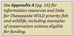 - Enhancing community capacity to advance Chesapeake WILD Program priorities, including knowledge and skills to restore, conserve, and connect fish and wildlife habitats and connect people and communities with nature and outdoor recreation.