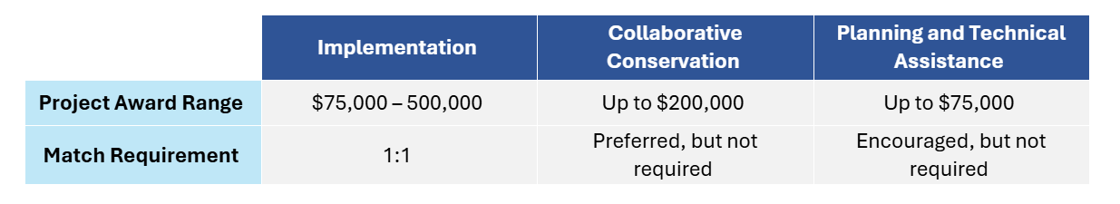The ability and extent to which NFWF is able to make awards is contingent upon receipt of funds from federal agencies and/or other funding partners. Final funding decisions will be made based on the applications received and the level and timing of funding received by NFWF.