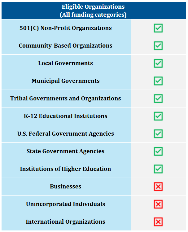 Compliance Requirements – Projects selected may be subject to requirements under the National Environmental Policy Act, Endangered Species Act (state and federal), and National Historic Preservation Act. Documentation of compliance with these regulations must be approved prior to initiating activities that disturb or alter habitat or other features of the project site(s). Applicants should budget time and resources to obtain the needed approvals. As may be applicable, successful applicants may be required to comply with additional Federal, state, or local requirements and obtain all necessary permits and clearances.