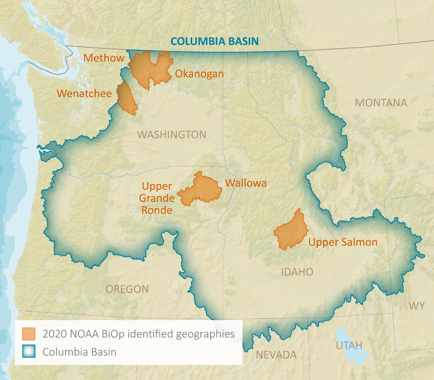 All proposed activities for BPA funded projects must be within the Columbia River Basin in Montana, Idaho, Oregon, and Washington. Priority will be given to areas listed in the 2020 National Oceanic Atmospheric Administration’s (NOAA) Biological Opinion (BiOp) that aims to recover the Basin’s native anadromous species which are listed as threatened or endangered by the federal Endangered Species Act (ESA). A portion of the funding from BPA is dedicated to the areas of the Columbia River Basin that are covered by the Confederated Tribes of the Umatilla Indian Reservation, the Confederated Tribes of the Colville Reservation, and the Spokane Tribe of Indians. Proposals in these geographies should be separate from proposals for other geographies.